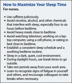 The health-related behaviors of nurses may be influenced by the culture, structure, and policies of the organization in which they are employed and by such personal factors as age, gender, marital status, emotional support, psychological makeup, overall physical health, perceived health, perceived benefits or barriers to health, and perceived confidence in the ability to effect change. A comprehensive approach that takes all variables into account is more likely to inspire health behavior change among nurses. Continuing education on the importance of sleep, fatigue management, and sleep hygiene is one way to promote behavioral changes that can improve the quality and quantity of sleep among nurses. There are also a variety of practices that can help nurses maximize the time they do spend sleeping, even if they must work extended hours or non-day shifts (see How to Maximize Your Sleep Time). In addition to providing information about the importance of sleep, fatigue management, and sleep hygiene measures, nursing leaders should reexamine policies to ensure that all nurses have "a work schedule that provides for adequate rest and recuperation between scheduled work."51 To that end, scheduling should not exceed 12 hours in a 24-hour period52 and nursing management should consider altering schedules to make them more compatible with circadian rhythms (see Policies That Promote Adequate Rest and Recuperation).