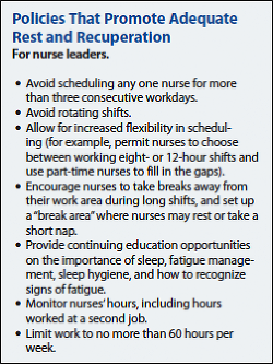 In December 2011, the Joint Commission issued a Sentinel Event Alert identifying shift length and work schedules as significant factors affecting health care workers' quality and quantity of sleep.12 In September 2014, recognizing the dangers that "inadequate sleep and resulting fatigue" pose to both patients and nurses, the American Nurses Association (ANA) released a position statement calling for nurses and their employers "to carefully consider the need for adequate rest and sleep when deciding whether to offer or accept work assignments, including on-call, voluntary, or mandatory overtime."13 This article discusses the acute and chronic effects of sleep loss on nurses, strategies that can help nurses increase the quantity and improve the quality of their sleep, and policies that nursing leadership can implement to promote adequate rest and recuperation between work shifts for nursing staff.