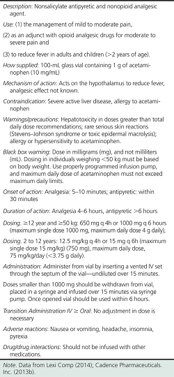 In the following discussion, an overview of selected uses and benefits of IV acetaminophen therapy is discussed. Administration guidelines, necessary cautions, and implications for nursing are also addressed.