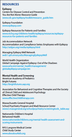 Nurses play a key role in identifying the need for further evaluation of possible psychiatric or neurocognitive conditions often diagnosed in people with epilepsy and in directing patients to the appropriate local and national resources, many of which can be found online (see Resources). Particularly helpful is the Epilepsy Foundation, which provides comprehensive information for patients and their families, health care providers, schools, community agencies, and first responders.