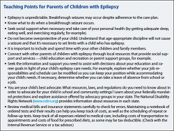 * During the first year after diagnosis, parents are adjusting to new medical terms and changes in routine. They may feel anxious over the unpredictability of their child's seizures and unprepared to make decisions or solve problems related to their child's care. Many have questions about possible causes of epilepsy and treatment effects. Providing them with a written seizure treatment plan (a template is available at http://www.epilepsy.com) will increase their ability to manage seizure activity and boost their confidence. It is also helpful for families to run periodic "seizure drills," practicing what every family member should do if the child has a seizure. Parents may also experience heightened stress from relationship, health, sleep, work, education, and family management problems, so patient teaching should address these issues as well (see Teaching Points for Parents of Children with Epilepsy).