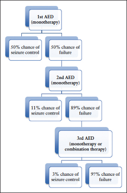 Nearly 40% of patients diagnosed with epilepsy require treatment with more than one AED, and those with refractory seizures may need to take three or more drugs in tandem.8, 9, 11 For some of these patients, undergoing serial trials of various AEDs produces fewer adverse drug effects than reliance on a single AED, but it seldom results in true seizure control. In fact, the chance of seizure control diminishes with each successive trial of an AED (see Figure 1 8, 9). In a 20-year outcomes analysis,9 conducted as a follow-up to a 14-year prospective study of children, adolescents, and adults diagnosed with epilepsy and treated with a first AED at the same epilepsy treatment center,8 about half of patients achieved seizure control with the first AED, but only about 11% of patients attained seizure control with the second drug as monotherapy, fewer than 1% did so with a third drug as monotherapy, and fewer than 3% achieved remission with a third trial of two or more AEDs.