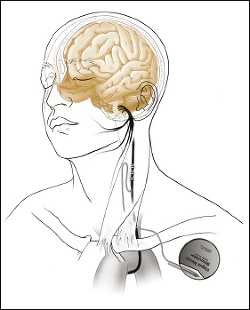 Vagus nerve stimulation. The vagus nerve stimulator is a small device that is typically placed under the left clavicle. A thin lead is attached to the device and to the left vagus nerve in the lower neck (see Figure 2). The device is programmed wirelessly with a handheld computer and wand. Several parameters can be adjusted to optimize efficacy and minimize adverse effects associated with VNS, such as coughing. A handheld VNS magnet, applied for 30 to 60 seconds over the implanted device, can be used to interrupt breakthrough activity.