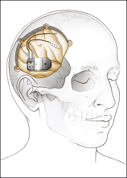 Responsive neurostimulation is a relatively new option for patients with partial seizures for whom the focus can be localized but not removed. Approved for use in the United States at the end of 2013, RNS uses a small microcomputer placed within the skull and electrodes placed on the brain's surface or within the structure of the brain, in or close to the source of the seizures (see Figure 3). Electrical signals sent from the electrodes and recorded by the device can be wirelessly transmitted with a handheld wand to a laptop computer. The data are then transmitted to a secure Web site, where they can be reviewed by the treating physician. The device can also be programmed to detect the patient's seizures; once it is doing so reliably, it can be programmed to deliver a small interfering stimulus to disrupt the seizures.