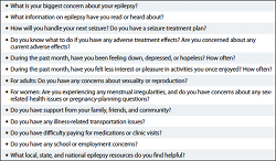 Although there is no definitive guideline that addresses comprehensive nursing care of patients with epilepsy, by asking the right questions and giving the patient positive feedback about the ways in which she or he is managing epilepsy, nurses can identify and address the concerns and care needs of patients with epilepsy and their family members (for a list of self-management questions, see Table 1). Since assessment time may be limited, the first question to ask should be, "What is your biggest concern about your epilepsy?" The patient's answer will then guide you in determining