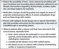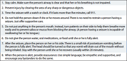 Seizure first aid. All people with epilepsy and their families should be taught the basics of first aid for seizures (see Table 2). Caregivers and family members can also benefit from being certified in cardiopulmonary resuscitation (CPR). Remind all patients with epilepsy that they should have a written seizure treatment plan that they carry with them at all times. Treatment plans should provide the following information: