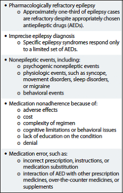The choice of first AED is commonly made in consultation with a neurologist, though some primary care providers have experience in the initial treatment of epilepsy and are up to date on available AEDs. When appropriately selected, the first AED controls seizures in approximately half of newly diagnosed patients.8, 9 If the first AED does not control seizures, then reasons for its lack of effectiveness must be explored (see Table 4). After one or two AED failures with good medication adherence, one of the following scenarios is likely.