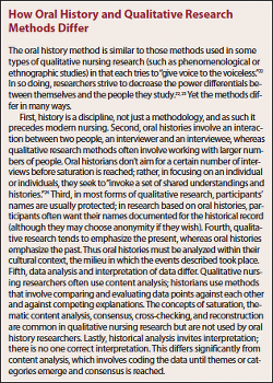 Especially when there are no or few written documents available, oral histories can serve as a rich resource. In his pioneering work, Oral Tradition as History, Vansina argued that storytelling was a culturally appropriate research method, although he had to convince the historical establishment that it was respectable.8 We also examined the work of Henige and other historians, focusing on oral history with an African-centered emphasis.9-12 Until more written sources emerge, historians must turn to the oral record. It's worth noting that as time passes, the number of older nurses who studied and worked during and after colonization and might provide their histories is diminishing.