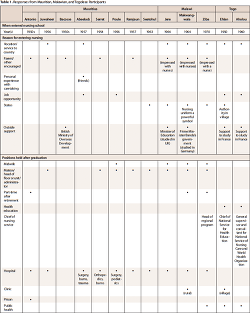 The African researchers did play major roles in designing and approving the interview questions, conducting and transcribing the interviews, interpreting the data, and writing up the findings. The semistructured, open-ended questions focused on the professional aims, education, relationships, and successes and struggles of the participants. Interviews were conducted one-on-one and face-to-face. Each participant was interviewed once, with each interview lasting about 45 minutes. The local researchers began the interviews by asking participants why they had entered nursing, whether they'd had outside support, and what their work trajectories had been (for more details, see Table 1). Then the researchers explored how participants understood their work, created new professional identities, and developed practice models within the context of decolonization and independence.