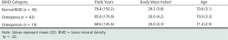 Participants' bone density was determined through the use of DXA, considered to be the most accurate tool to measure BMDs (NOF, 2013). Each participant had DXA scans completed on the GE Lunar Bone Densitometry with BMDs calculated from the hip and spine region. The density scores were categorized using the World Health Organization's standards for diagnosing osteopenia and osteoporosis. There are several classification models for osteopenia and osteoporosis, but inconsistencies have been reported with each method. Our team selected the World Health Organization standards because a large portion of prior research has utilized this classification guideline. The diagnosis of osteopenia is reported when the BMD is between 1 and 2.5 standard deviations lower than (T-score, -1.0 to -2.5) that of a young healthy adult. The diagnosis of osteoporosis is reported when the BMD is greater than 2.5 standard deviations lower than (T-score, -2.5) that of a young healthy adult. Research participants were divided into three categories on the basis of their BMD scores; normal BMDs, osteopenia, or osteoporosis. Statistical analyses were performed using the 2011 version of Statistical Product and Service Solutions (SPSS Inc., Chicago). Frequencies, means, and standard deviations were calculated for categorical level. Spearman's correlation and analysis of variance (ANOVA) were utilized to calculate categorical and interval level data with significance level set at p < .05.