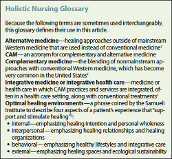 According to the National Center for Health Statistics, 33.2% of American adults reported using some form of alternative or complementary medicine in 2012.1 (For the meaning of terms used in this article, see Holistic Nursing Glossary.2, 3) In 2007, consumer out-of-pocket expenditures for complementary and alternative medicine (CAM) providers, products, and services totaled nearly $34 billion.4 Previous studies have shown that the majority of CAM consumers seek relief from chronic issues, such as back and neck pain, joint pain or stiffness, and anxiety or depression, which are difficult to treat with conventional medicine alone.5 The 10 modalities used most often by U.S. adults in 2012 were dietary supplements other than vitamins and minerals; deep breathing exercises; yoga, tai chi, or qigong; chiropractic or osteopathic care; meditation; massage; diet-based therapies; homeopathy; progressive relaxation; and guided imagery.2