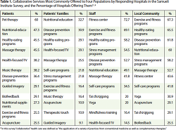 In 2006, the Samueli Institute surveyed executives at 125 Midwestern hospitals about the use of initiatives that support "optimal healing environments" through the practice of 33 "collaborative healthcare services"-ranging from conventional approaches (nutritional education, for example) to those falling under the umbrella term CAM (Reiki, for example)-these hospitals offered to four distinct populations: patients, patients' family members, staff, and members of the local community.11 The 55 completed surveys (representing a 44% response rate) indicated that the hospitals offered an average of eight different services to community members, 6.8 to patients, 6.3 to staff, and 3.8 to patients' families, though the services most commonly offered to each population differed considerably (see Table 111). Although hospitals tended to offer more services that would be described as "conventional" or "mainstream Western medicine" to all of these populations, the services that would be described as CAM were more commonly offered to community members than to any of the other populations.11
