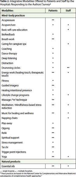 Evolution of care programs. Nurse leaders reported that once integrative care was initiated, its use spread across units, and hospitals began adding new modalities to the repertoire of integrative care options. Many respondents reported that new integrative modalities were required to undergo council review prior to implementation to ensure safe, evidence-based practice. Standards were created around the education and competency of staff members, and certification in specific modalities was often encouraged. As hospitals included more integrative modalities, some expanded to include full-time clinical positions for practitioners providing integrative care. Program expansion created a need for more educational programs. Over time, staff participation in these programs increased. As Lauren Arce, MSN, RN, AHN-BC, OCN, integrative medicine nurse coordinator at the University of Florida Health Shands Arts in Medicine program, said, "We respond to evolving needs, interests, and concerns of patients, families, staff, and the organization." At Scripps Health, D'Andrea reported that "integrative medicine began [with the slogan] Healing People and Changing Lives Through Science and Compassion. The health system soon developed this philosophy and now embraces healing touch, mindfulness-based stress reduction, fitness, cooking classes, stress management, yoga, and nutrition [as part of a staff] wellness program," as well as a program for patients. A number of hospitals offered integrative practices to both patients and staff members (see Table 2).