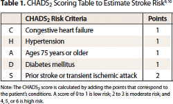 Whether a patient with atrial fibrillation needs anticoagulation treatment is determined by stroke risk, regardless of whether the rhythm converts and is maintained in sinus rhythm.3 CHADS2-which stands for congestive heart failure, hypertension, ages 75 years or older, diabetes mellitus, and prior stroke or transient ischemic attack-is a clinical prediction rule for assessing the risk of stroke in patients with nonvalvular atrial fibrillation and without significant aortic or mitral valve disease.9, 10 The results are used to determine the need for anticoagulation therapy; the higher the CHADS2 score, the greater the stroke risk. (See Table 1 for how to calculate the score.9, 10)