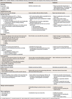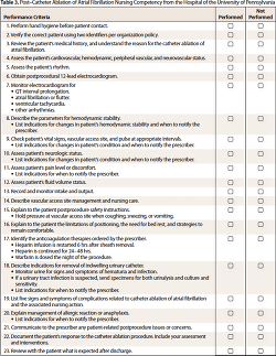 The success of catheter ablation for atrial fibrillation depends on nurses who are familiar with indications for the procedure, pre- and post-procedure monitoring, possible complications, and discharge teaching, and who understand the care of patients undergoing this procedure. Owing to the potential for postoperative complications, nurses at the Hospital of the University of Pennsylvania have developed a skills checklist to standardize nursing competency based on the nursing care protocol. Table 3 summarizes the specific skills required.