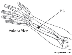 Acupressure is used in various ways outside the health care setting-in community wellness centers, for example. A well-known form of acupressure called shiatsu blends the use of direct pressure at specific points of the body with a systematic form of massage to promote healing and wellness.5 One popular application of acupressure, used by thousands of people daily, is stimulation of the pericardium 6 (P6) point above the wrist, which many people believe can prevent motion sickness (see Figure 13). Stimulation may be achieved by finger pressure or by specialized elastic wristbands that apply direct pressure to the P6 point. While this practice is common, research on its efficacy for this specific symptom has produced conflicting evidence. Further research is warranted.