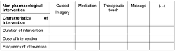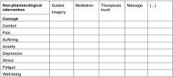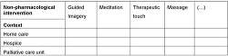 In other words, the literature on non-pharmacological interventions in PC reports in which much attention has been given to the somatic aspects of comfort33-35 have not identified the other dimensions of comfort covered by the different non-pharmacological interventions. Furthermore, it is known that different interventions have been implemented in different contexts;32,33 however, a summary of non-pharmacological interventions implemented in the context of PC does not exist. Furthermore the literature does not clarify the characteristics of the different non-pharmacological intervention programs. Finally the existence of non-pharmacological interventions implemented and evaluated in non-oncologic populations is unclear.