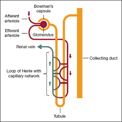 Most people have two kidneys. Each kidney consists of approximately 1 million functioning units called nephrons. Blood flows into each nephron through the glomerulus, a cluster of capillaries that serves as the filter of the nephron. Filtrate from the glomerulus flows into a cup-like structure known as Bowman's capsule, then through the proximal tubule, the loop of Henle, and the distal tubule. This series of tubules modifies the filtrate primarily by reabsorbing water and needed electrolytes into the bloodstream through the arteriovenous capillary bed, which surrounds the tubules. The modified filtrate (urine) then flows into the collecting duct, which joins larger and larger ducts and eventually drains into the renal pelvis. From the renal pelvis, the urine drains through the ureter into the bladder. (See Figure 1.)