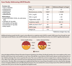As with eGFR, explaining UACR to patients can help them better understand their disease and promote self-management. (See Case Study: Addressing UACR Results.) Increased albuminuria is often the first sign of CKD. Nurses are sometimes the first to identify a patient's CKD on the basis of persistent albuminuria. If a nurse encounters a patient with albuminuria who has not been diagnosed with CKD, the nurse should ask the patient what her or his primary care provider has said about the patient's kidneys. Often the answer is "nothing." The primary care provider may mention the kidneys, along with a list of other concerns, but with little explanation.