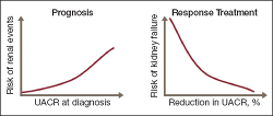 Reducing albuminuria. An elevated urine albumin level at the time of CKD diagnosis was associated with an increased risk of adverse kidney events in the Chronic Renal Insufficiency Cohort Study.32 This risk was shown to decrease when albuminuria was reduced following treatment with an ARB in the RENAAL (Reduction in End Points in Noninsulin-Dependent Diabetes Mellitus with the Angiotensin II Antagonist Losartan) Study.33 (See Figure 2.32, 33)