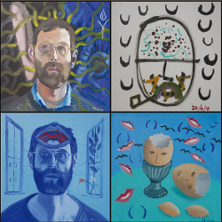 Born in 1949, Charnley was diagnosed with schizophrenia as a young adult after suffering multiple mental breakdowns while attending art school. He continued to work as an artist despite his struggles; he had a solo exhibition in London in 1989, and several of his paintings were purchased by Bethlem Royal Hospital, a psychiatric hospital in London. In March 1991, Charnley began his series of self-portraits. He kept a diary to accompany the portraits, noting what he was feeling and what medication he was taking. For example, of the painting shown at top left, he explained: "Very paranoid. The person upstairs was reading my mind and speaking back to me[horizontal ellipsis]. The large rabbit ear is because I was confused and extremely sensitive to human voices, like a wild animal."