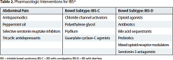 IBS is a multifactorial disorder. For this reason, pharmacologic management focuses on the predominant bowel symptom (diarrhea or constipation) and abdominal pain (see Table 223). Patients with IBS-M may require treatments for both diarrhea and constipation.34 Patient education, suggestions for lifestyle modifications, and reassurance should be provided with all IBS treatments.