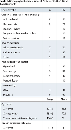 Participants. Saturation was achieved with a final sample of eight women and two men, for a total of 10 participants. Their ages ranged from 37 to 84 years, with a mean age of 66.3 years. Length of time in the caregiving role varied from one to 13 years, with a mean of five years. The ages of the care recipients ranged from 58 to 92 years, with a mean age of 77.1 years. Their average age at time of diagnosis was 72 years. Half of the participants had attained a bachelor's or master's degree. Nearly two-thirds (60%) lived in suburban settings. (See Table 1 for more details.)