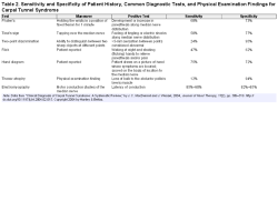 The AAOS guidelines state that there is strong evidence supporting not using these tests as independent physical examination maneuvers, as each of these tests, when used alone, has a poor or week association with diagnostic accuracy (American Academy of Orthopaedics, 2016). The AAOS guidelines state that there is moderate evidence in the use of diagnostic questionnaires and electrodiagnostic studies for the diagnosis of CTS. The diagnostics questionnaires recommended by the guidelines are the Katz hand diagram and the CTS-6. The Katz hand diagram is a self-administered tool that allows the individual to draw on a hand diagram where symptoms are located and then is scored on the basis of location inside and outside the median nerve distribution (Katz & Stirrat, 1990). The CTS-6 combines symptom history of numbness in the median nerve distribution along with nighttime symptoms and physical examination findings of thenar atrophy or weakness, positive Phalen's test, loss of 2-point discrimination, and positive Tinel's sign to aid in the diagnosis of CTS (Graham, 2008). See Table 2 for the comparison of sensitivity and specificity of provocative testing for CTS.