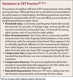CRT refers to the time required for blood flow-and thus color-to return to the distal capillaries after the release of compression sufficient to cause blanching of the fingertip or knee. CRT is believed to indicate peripheral perfusion, with a longer CRT denoting reduced capillary perfusion.9 Although CRT is often measured as a part of patient assessment, there are no standard recommendations for the practice or interpretation of this measurement (see Variations in CRT Practice10-17).