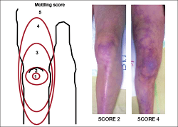 To address this limitation, Ait-Oufella and colleagues created a scoring system with which to quantify the extent of mottling on the leg (when positioned at heart level).23, 24 The SMS incorporates a six-point scale, ranging from 0, no mottling, to 5, severe mottling extending to the groin (see Figure 1). The SMS is limited, however, in that it cannot be used on patients with dark skin.23, 25