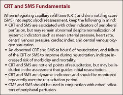 These studies identify several implications for nursing practice (see CRT and SMS Fundamentals). Most notably, the practice and assessment of these skin perfusion measurements should be standardized, with all providers taught how to correctly perform and interpret findings. It should be emphasized that the normalization of CRT and SMS are not resuscitation end points, but rather indirect indicators of perfusion and components of the ongoing assessment of resuscitation adequacy. Serial monitoring and documentation of these parameters is recommended, and as outlined in the SSC six-hour bundle, resuscitation should continue toward an established end point, such as the normalization of lactate levels. CRT and SMS should not be used as the sole indicators of perfusion. However, poor outcomes are associated with the failure of CRT or SMS to improve and with continued abnormal peripheral perfusion following the normalization of systemic hemodynamic indicators. Either situation suggests the need for a more in-depth assessment and continued resuscitation.