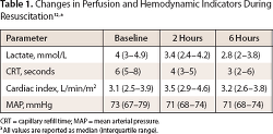 CRT interpretation. CRT has been associated with other perfusion indicators-such as lactate levels, organ function, urinary output, forearm-finger temperature gradient, and central-toe temperature gradient-but is not generally associated with systemic hemodynamic indicators such as cardiac index, CVP, ScvO2, mean arterial pressure (MAP), and heart rate.10, 12-14, 19, 22 In 41 patients with septic shock, Hernandez and colleagues found that both CRT and lactate levels decreased over the six-hour resuscitation period.13 Patients who had a normal CRT of less than four seconds and a central-toe temperature gradient below 7[degrees]C at six hours attained a normal lactate level at 24 hours. In a subsequent study, investigators observed similar results for CRT in 84 patients who survived septic shock.12 Although the median cardiac index, CVP, and MAP were all within normal ranges at the start of resuscitation, the lactate level was abnormal in all 84 patients, and CRT was abnormal (greater than four seconds) in 39. Notably, these patients demonstrated a progressive decrease in lactate level and CRT over the first six hours of resuscitation. These studies demonstrate the relationship between CRT and other perfusion indicators, as well as the variable period during which hemodynamic and perfusion indicators normalize during resuscitation. In addition, they underscore the fact that no single value can be used to assess the adequacy of perfusion or resuscitation.