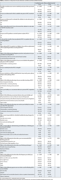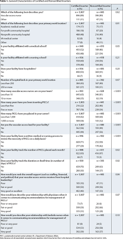 Study purpose. Understanding whether and how certification might affect PICC practices and outcomes is critical to informing policy and improving patient safety. Using data from a national survey of vascular access specialists, we compared the characteristics of certified PICC inserters to those of noncertified inserters. Our objective was to gather information regarding whether and how certified and noncertified PICC inserters differ with respect to their practices and views about PICC use. We hypothesized that, compared with noncertified inserters, certified inserters would report having greater experience and would be more likely to work in leadership positions. We also hypothesized that certified inserters would report greater use of evidence-based practices.