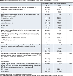 Variations in approach to complications and views about PICC practice. Several differences in reported management of PICC complications were noted. Similar percentages of certified and noncertified inserters reported the use of a tissue plasminogen activator to treat catheter-related occlusions (92% versus 91%). But their approaches to managing PICC-related phlebitis varied somewhat. For instance, fewer certified than noncertified inserters said they would discuss the situation with a physician (41% versus 46%), but more certified than noncertified inserters said they would do so with a nurse (10% versus 7%). The two groups also differed regarding the management of PICC-related deep vein thrombosis, with more certified than noncertified inserters recommending ultrasound evaluation (59% versus 45%) and notification of all caregivers (59% versus 45%).