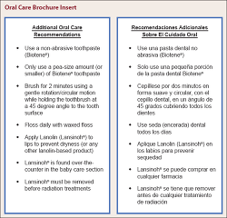 Practice change. Those in the intervention group received the same care as those in the usual care group plus targeted education, a comprehensive oral care kit, and information on how to use the kit. The targeted education included a brochure from the U.S. Department of Health and Human Services, Head and Neck Radiation Treatment and Your Mouth,25 and a one-page insert, which was developed by the team, translated into Spanish for use as needed, and placed inside the brochure (see Oral Care Brochure Insert).