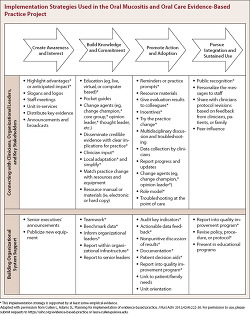 For a list of the strategies used in this practice change, see Implementation Strategies Used in the Oral Mucositis and Oral Care Evidence-Based Practice Project. A more complete description of how to use these strategies is available elsewhere.1, 36, 37