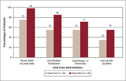Formative evaluation is an important part of the evidence-based practice process. After the intervention began, for instance, the nurse care coordinator reported that patients were requesting additional oral care supplies more frequently than the team anticipated. This led to a revision in the timing of the oral kit replenishments. The project team learned multiple lessons during this practice change process. First, it was determined that follow-up was needed to ensure the clinicians involved in the pilot project consistently followed the same practices. Nurses, for instance, sometimes provided two different educational brochures, and physicians sporadically ordered "magic mouthwash." In addition, the lanolin lip balm inventory and that of some other supplies in the oral care kit were easily depleted and not automatically reordered. These items had to be special ordered by the nurse manager after the nurse care coordinator communicated that the inventory was getting low. It was difficult to predict demand, and sometimes there were unavoidable delays in the availability of these products. Also, as new clinicians were hired, they needed to be familiarized with the oral care intervention and their role in it.