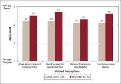 Patients. Feedback provided by patients during radiation treatment week 4 to 5 demonstrated improvement in oral hygiene behaviors. More patients in the intervention group reported brushing at least daily, using Biotene toothpaste, performing oral rinses at least twice a day, and using lanolin lip balm, compared with those in the usual care group (see Figure 1). Patients in the intervention group also felt more strongly than those in the usual care group that they knew how to prevent oral mucositis, felt prepared for good oral care, and were aware that Biotene toothpaste and oral rinses were helpful (see Figure 2).