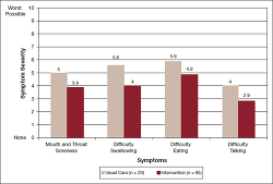 Based on the feedback of patients in the intervention group, compliance with the targeted education and oral care kit intervention led to a reduction in their symptoms at week 4 to 5 of radiation treatment, when symptoms are expected to peak (see Figure 3). The intervention patients reported less severity than the usual care patients regarding the following symptoms: mouth and throat soreness (3.9 versus 5), difficulty swallowing (4 versus 5.6), difficulty eating (4.9 versus 5.9), and difficulty talking (2.9 versus 4). A noteworthy finding was that patients in the intervention group reported less difficulty with xerostomia than those in the usual care group (3.1 versus 4.1) one month following the completion of treatment, when xerostomia is expected to persist. This finding is important because patients who have undergone radiation therapy traditionally report long-lasting issues with xerostomia.
