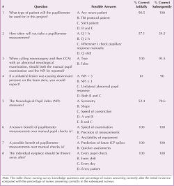 The survey tested the knowledge of neurologic implications of increased ICP, the study protocol, the pupillometer device use and benefits, and the reporting of pupillometer findings (Table 1). At baseline (after in-servicing), overall knowledge regarding both implications for the neurologic population and use of the device was already high. There were lower scores on responses to questions 2 and 3, relating to study protocol regarding device use (and, specifically, frequency of pupil assessments) and clinical use of pupillometer findings (reporting to advanced practice providers), and question 5, regarding definition of the NPi. There was an overall nonsignificant trend toward increased knowledge both overall and for each question.