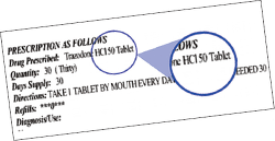 TraZODone is a selective serotonin reuptake inhibitor indicated to treat major depressive disorder. A prescription for traZODone 50 mg tablets (shown below) was misread as "Trazodone HC 150 Tablet" when the lowercase letter "l" in HCl was placed too close to the strength (50 mg) and was misread as the number 1. A pharmacy technician interpreted this as 150 mg and prepared the label incorrectly. The error was identified by a pharmacist during final verification (there is no traZODone HC), and the error didn't reach the patient.