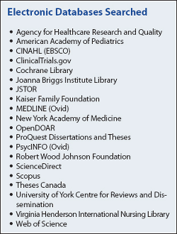 Selection of studies for inclusion. A four-step search strategy for articles published in English from 1990 through 2015 was used. First, we searched MEDLINE and CINAHL using an initial list of keywords generated from a concept map based on the research question; this method also allowed us to identify additional keywords. Second, in consultation with a health sciences librarian, we used the expanded list of keywords to search 20 databases (see Electronic Databases Searched). Third, the reference lists of all identified articles were searched to identify additional studies. Lastly, we searched the selected Web of Science articles by author names to determine if any other relevant publications existed.
