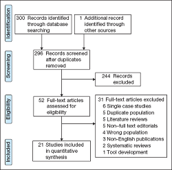 Of the 301 articles originally identified, 52 appeared to meet the inclusion criteria based on the abstract or title. The review team subsequently excluded 31 of these. Reasons for exclusion were as follows: six were single case studies; five used a duplicate sample; five were literature reviews; five were not full text (two were letters to the editor, three were abstracts only); four studied the wrong population (postdischarge patients); three were non-English publications; two were systematic reviews (one a review of interventions, the other a review of diagnostic tools); and one was about the validity and reliability of tool development. Our review examined the remaining 21 quantitative studies, of which 11 were cohort studies and 10 were case series or case reports. Of these 21 studies, 10 were conducted in the United States, seven in the Netherlands, three in India, and one in South Africa. (For a flow diagram of the search strategy, see Figure 1.) Per the Joanna Briggs Institute's levels of evidence,17 all 21 studies were graded as level 3 or 4.