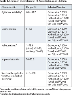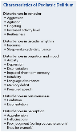 Characteristics of acute pediatric delirium identified in the 21 studies included agitation, disorientation, hallucinations (primarily visual), inattention, and sleep-wake cycle disturbances. Aggression, irritability, restlessness or fidgeting, and impaired memory were among others noted. Jones and colleagues reported that such characteristics were significantly more common in children in pediatric or cardiovascular ICUs than in children in general units.27 In a case series of very young children with neuroblastoma, Traube and colleagues described a lack of sustained sleep, agitation (such as thrashing in bed), and a lack of eye contact as characteristics of postoperative delirium.30