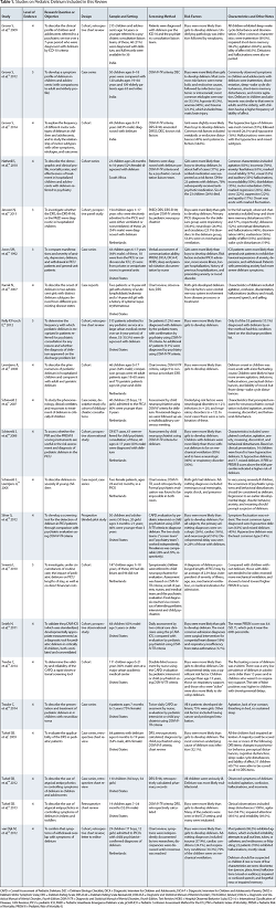 The target population was hospitalized children, from birth through 21 years, who had been diagnosed with delirium. Studies were selected for inclusion if they involved this target population, used a delirium screening method, described risk factors for or characteristics of delirium episodes (or both), and were published in English. Single case studies, intervention studies, and qualitative studies, as well as non-English publications, were excluded.