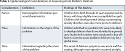 In accordance with the epidemiological framework of person, place, and time, we found the following: risk factors may include male sex, preexisting anxiety, developmental delay, and being on mechanical ventilation (person); the five most common characteristics of pediatric delirium include agitation, disorientation, hallucinations (primarily visual), inattention, and sleep-wake cycle disturbances; patterns of delirium symptoms in children are similar to, but not exactly the same as, those found in adults and the elderly; among hospitalized children, the most susceptible were those admitted to a PICU (place); and, although the symptoms of pediatric delirium fluctuate, many episodes occurred at night (time). (See Table 3.) A key finding of this review is that delirium is multifactorial, related to treatment (specifically, mechanical ventilation) and to a hospital environment (such as the PICU) that deprives patients of normal sleep-wake cycles and familiar routines.