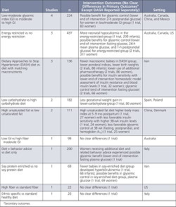 Table 4 lists 19 trials of different types of dietary advice given to women with GDM; the number, size, and location of the studies; and outcomes from the intervention.12 Recognizing that the current evidence is very limited, the authors concluded that there were no clear differences in outcomes, except for a possible reduction in cesarean delivery for women receiving a DASH (Dietary Approaches to Stop Hypertension) diet as compared with a control diet.