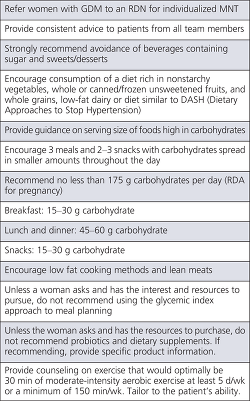 Medical nutrition therapy is considered the cornerstone of treatment for GDM. Women who receive only general dietary advice such as that listed in Figure 1 are less likely to achieve glycemic control compared with women who receive tailored MNT from an RDN. Table 5 summarizes the approach we recommend to the teams in our clinic who provide care for women with GDM. Because the stress associated with the diagnosis of GDM can be reduced if all providers help the women improve their diabetes self-management behaviors including a diet, physical activity, and self-monitoring plan tailored to the patient's life circumstances.18 In addition, strong communication between the healthcare team and the woman is critical. Based on our review of the evidence, we compiled the messages we would like our team to give consistently (Table 4). We encourage the RDNs who provide care to women with GDM to proactively reach out to the physicians and other team members to provide this advice until further research warrants a change in approach.
