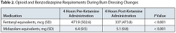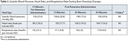 Patients' opioid and benzodiazepine requirements during burn wound care in the four hours following ketamine administration were significantly reduced (see Table 2). Regarding vital signs, compared with values taken every 15 minutes in the hour before ketamine administration, there were no statistically significant changes in systolic blood pressure, heart rate, or respiratory rate at 15, 30, and 45 minutes following ketamine administration (see Table 3). No cases of hypo- or hypertension, tachycardia, hallucinations, vivid dreams, agitation or anxiety, or nausea and vomiting were noted. RASS scores and oxygen requirements after ketamine administration were similar to those measured beforehand. One patient experienced respiratory depression from oversedation that immediately followed the concurrent administration of fentanyl 100 mcg and ketamine 0.6 mg/kg. The patient received naloxone and responded appropriately; no further intervention was needed.