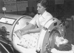 Pictured: Patients with respiratory paralysis were immobilized in Drinker respirators and required constant nursing care.